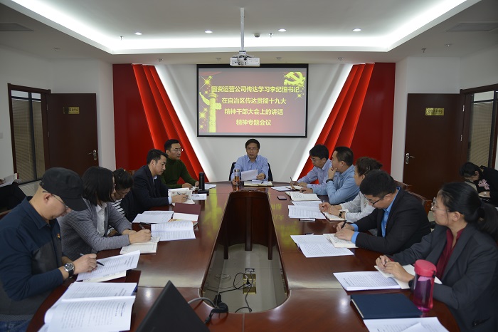 11月1日,国资运营公司召开全体党员大会,传达学习李纪恒书记在自治区传达贯彻十九大精神干部大会上的讲话精神,安排部署学习贯彻党的十九精神工作。公司党总支副书记张林曙主持会议,并传达了李纪恒书记在自治区传达贯彻十九大精神干部大会上的讲话精神。公司党总支书记、董事长、总经理王力军就国资运营公司学习宣传贯彻十九大精神、推进公司改组发展工作提出具体要求。