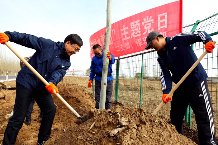 当日清晨,在呼和浩特市园林局工作人员的带领下来到植树现场,大家个个态度积极、热情高涨、兴致勃勃地投入到植树活动中。植树现场是一派紧张有序的劳动景象,三人成组,五人成团,大家有的扶苗,有的填土踩实,各个环节衔接有序,配合默契,真正是劲往一处使,汗往一处流,充分发扬了团结、互助、有爱的精神。公司领导班子身先士卒、奋战当先、干劲十足,起到了表率作用。经过一上午的挥汗奋战,134棵小树整齐的栽到了金盛道路旁,在四月的阳光中奏响绿色希望,圆满完成了这次植树任务,为宽阔的道路增添了一片生机勃勃的绿色