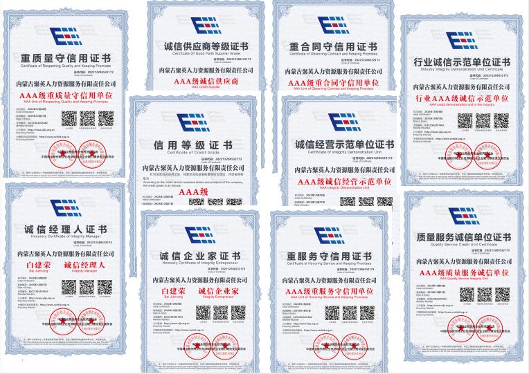 在国资公司正确领导下,在人才控股(集团)全体成员坚持不懈的努力下,近日,人才控股(集团)旗下聚英人力资源服务有限公司被中国商业股份制企业经济联合会企业能力建设专业委员会评为“3A级信用企业”,其中包括:《3A级企业信用等级证书》、《诚信经理人证书》、《诚信企业家证书》、《3A级诚信供应商证书》、《3A级诚信经营示范单位证书》、《3A级行业诚信示范单位证书》、《3A级质量服务诚信单位证书》、《3A级重服务守信用证书》、《3A级重合同守信用证书》、《3A级重质量守信用证书》。